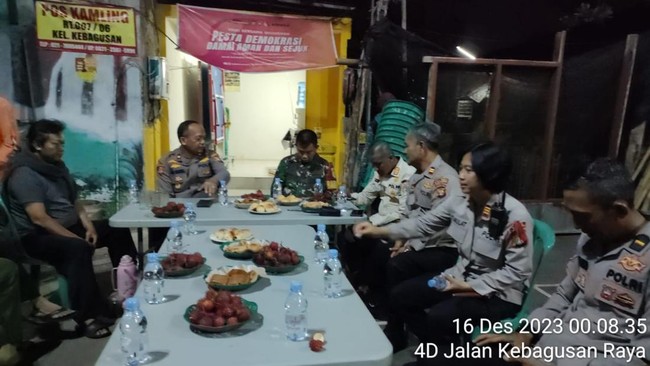 Polsek Pasar Minggu menggelar cangkrukan bareng warga di RW 06 Kebagusan Dalam, Jakarta Selatan. Kegiatan ini dilaksanakan untuk menjaga situasi kondusif menjelang Pemilu 2024.