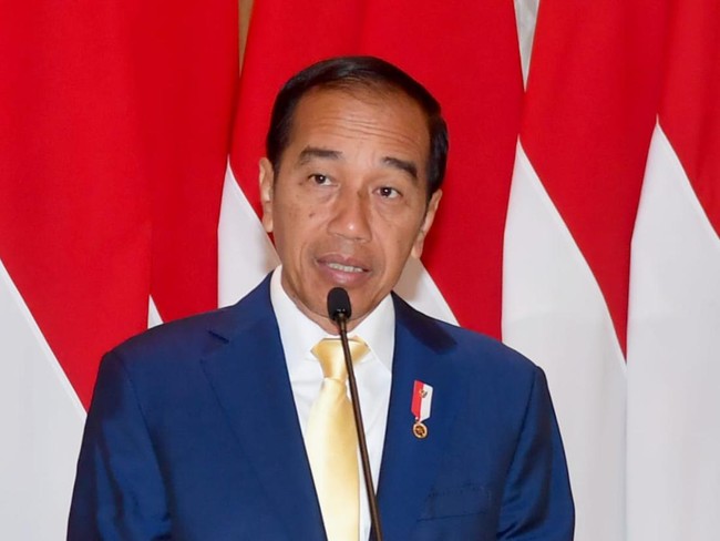 Jokowi didampingi Menteri Sekretaris Negara (Mensesneg) Pratiko, Sekretaris Kabinet (Seskab) Pramono Anung, Panglima TNI Jenderal Agus Subiyanto, dan Kapolri Jenderal Listyo Sigit Prabowo, saat menyampaikan pernyataan.