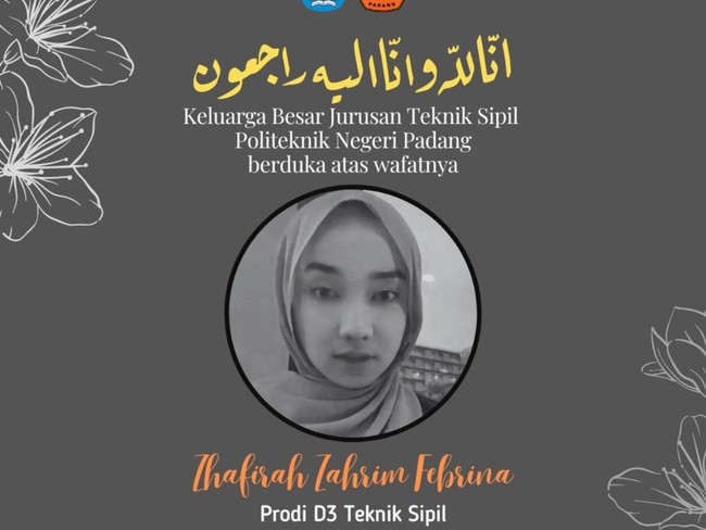 "Benar. Telah berpulang ke Rahmatullah Zhafirah Zahrim Febrina alias Ife, mahasiswa kami di Politeknik Negeri Padang, korban erupsi Gunung Marapi," kata Direktur Politeknik Negeri Padang (PNP) Surfa Yondri saat dikonfirmasi, dilansir detikSumut, Minggu (17/12/2023).