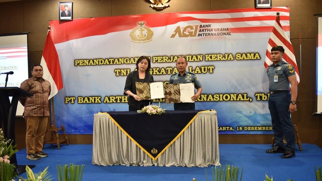 Adapun kerja sama tersebut ditandai melalui penandatanganan Perjanjian Kerja Sama antara kedua belah pihak di Oakwood Hotel, Jakarta, Senin (18/12). Perjanjian Kerjasama PT Bank Artha Graha Internasional TNI AL ditandatangani oleh selaku Wakil Direktur Utama Bank Artha Graha Internasional Christina Harapan, Direktur Bank Artha Graha Internasional Indra S. Budianto, dan Laksamana Pertama TNI Imam Subarkah.