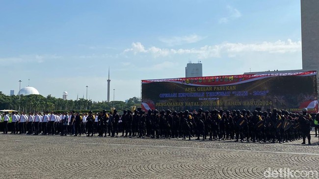Polri menggelar apel pasukan Operasi Lilin 2023 dalam rangka pengamanan Natal dan tahun baru 2024. Apel digelar di Silang Monas, Jakarta Pusat, pagi ini.