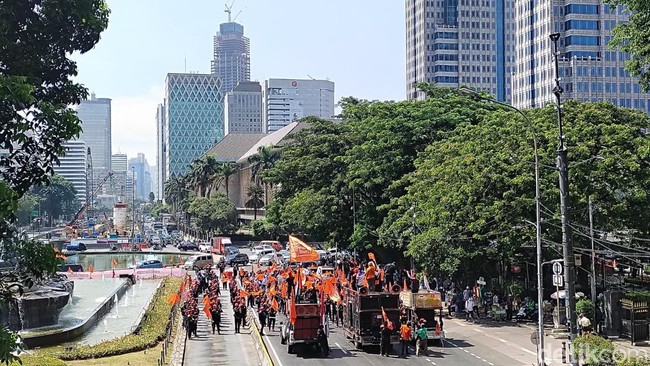 Massa buruh tiba di Patung Kuda, Jakarta Pusat, untuk menggelar unjuk rasa. Lalu lintas di sekitar lokasi terpantau padat merayap.