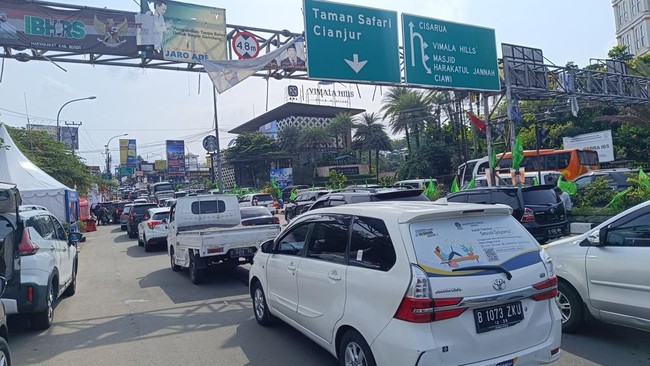Kendaraan terlihat didominasi oleh roda empat atau lebih. Meski terjadi kepadatan, kendaraan menuju Puncak masih bisa berjalan dengan pelan.