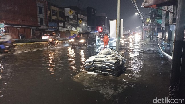 Pantauan detikcom di lokasi, Senin (25/12/2023) pukul 20.47 WIB, genangan meluber ke jalan raya yang berada di sekitar ITC Roxy Mas. Ketinggian rendaman air sekitar 5-10 cm.
