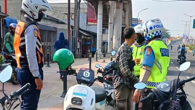 "08.54 Dalam rangka Ops Lintas Jaya 2023, Polri Sat Lantas Jakarta Timur bersama TNI dan Dishub melakukan teguran dan penindakan tilang manual kepada pengendara motor yang melanggar lawan arah di Layang Klender , Flyover Pondok Kopi Jl. Bekasi Timur Raya Jaktim," tulis akun TMC Polda Metro.