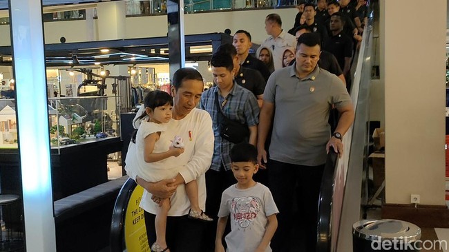 Presiden Joko Widodo (Jokowi) kembali mengajak cucunya, Jan Ethes Srinarendra dan La Lembah Manah, berjalan-jalan di Mal Solo Paragon di momen akhir tahun. Jokowi banyak dimintai foto oleh warga yang hadir.