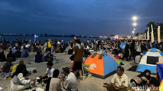 Pantauan detikcom di Pantai Lagoon, Ancol, Minggu (31/12/2023), pukul 18.50 WIB terlihat warga mulai berdatangan ke pantai. Warga juga terlihat mulai menggelar tiker di tepi pantai.