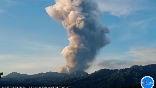 "Terjadi erupsi G. Dukono pada hari Rabu, 03 Januari 2024, pukul 06:52 WIT, tinggi kolom abu teramati ± 4.000 m di atas puncak," demikian dikutip dari akun X, PVMBG, Rabu (3/1/2024).