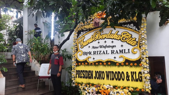 Karangan bunga dari berbagai tokoh berjejer di depan rumah duka mantan Menteri Koordinator Bidang Kemaritiman Rizal Ramli. Salah satunya ialah karangan bunga dari Presiden Joko Widodo (Jokowi) dan keluarga.