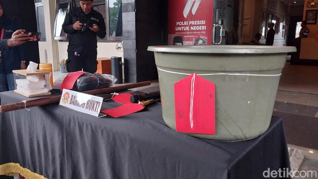Penampakan ember besar itu ditunjukkan oleh polisi dalam konferensi pers tersebut. Tampak ember itu berwarna abu.