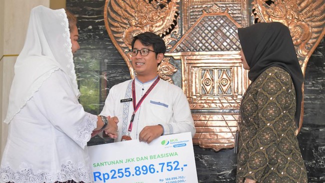 "Alhamdulillah klaim santunan kematian staff non-ASN Dinsos yang meninggal di tempat kerja bisa kami serahkan. Totalnya ada Rp 255.896.752, yang merupakan santunan kematian dan beasiswa bagi putrinya," kata Mbak Ita.
