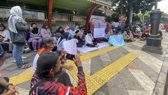 Tampak ortu SDN Pocin 1 juga membawa sejumlah poster. Poster itu bertulisan '78 Tahun Pendidikan Diabaikan'. Kemudian ada juga poster bertulisan 'Save SDN Pocin 1'.