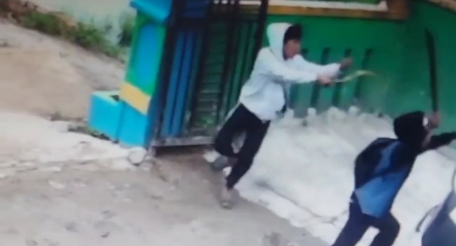 "Iya membawa senjata tajam jenis parang dan celurit, mereka masuk ke pintu gerbang sekolah sambil berteriak-teriak dan mangacungkan senjata tajam," tuturnya.