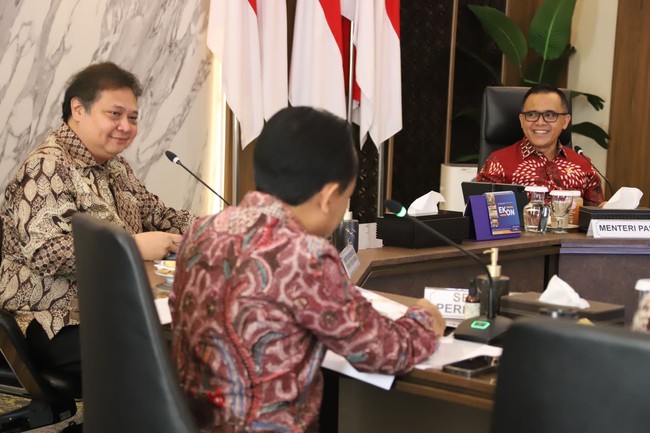 Menteri Pendayagunaan Aparatur Negara dan Reformasi Birokrasi (PANRB) Abdullah Azwar Anas bertemu Menteri Koordinator Bidang Perekonomian Airlangga Hartarto di Kantor Kemenko Perekonomian, Jakarta. Keduanya berdiskusi terkait penerapan pemerintahan digital.