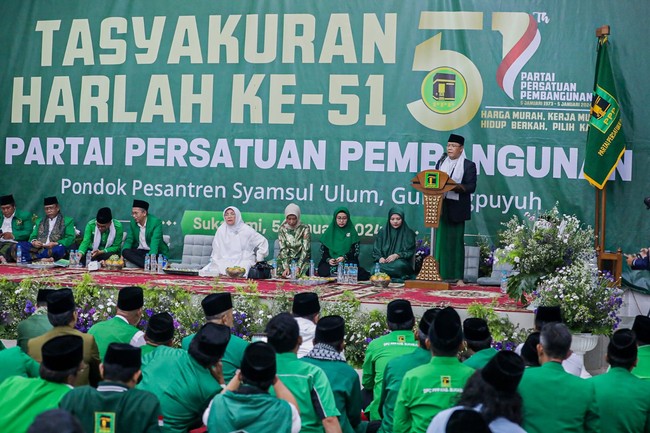 Partai Persatuan Pembangunan (PPP) menggelar kegiatan tasyakuran hari lahir ke-51 di Pondok Pesantren Syamsul Ulum, Sukabumi, Jawa Barat. Plt Ketua Umum PPP Muhamad Mardiono mengatakan, lewat tasyakuran kali ini serta doa dari para ulama, maka PPP diyakini dapat menghadapi Pemilu 2024 dengan baik.