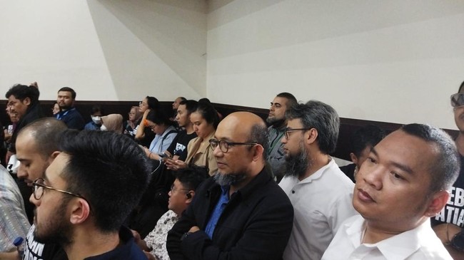 Mantan Penyidik KPK Novel Baswedan juga terlihat berada di dalam ruang sidang. Dia terlihat berdiri dan mengenakan jaket hitam. Novel sebelumnya juga menghadiri sidang dakwaan terhadap Haris-Fatia yang digelar tahun lalu.