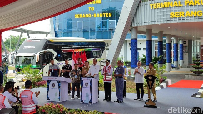 "Saya senang sekali terminal di Pakupatan ini ramai. Busnya tadi bisa 400 bus tiap hari, ini sangat bagus," ujar Jokowi.