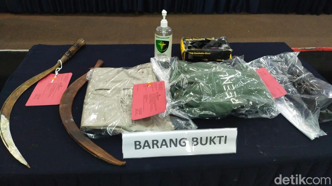Barang-barang bukti yang ditampilkan di antaranya 1 buah botol plastik warna hitam tanpa tutup, 1 bilah celurit bergagang kayu warna cokelat, sarung kulit celurit, 1 potong hoodie berwarna hijau, dan 1 potong celana kain panjang warna krem.