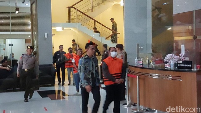 Dia tampak mengenakan baju tahanan KPK. Tangannya pun telah diborgol.