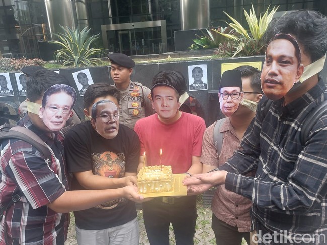 Empat orang menggunakan topeng pimpinan KPK itu terlihat berdiri berdampingan dengan seseorang yang menggunakan topeng bergambar wajah Harun Masiku. Mereka kemudian bersama-sama meniupkan lilin pada kue ulang tahun.