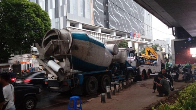 Truk molen menabrak tiang rambu hingga bikin lalu lintas di flyover Jalan Gatot Subroto, Jakarta Selatan, macet. Saat ini proses evakuasi sudah selesai.