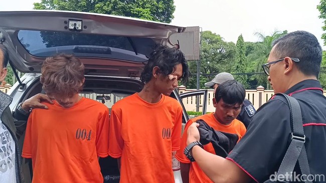 Tangan ketiga pelaku terlihat diborgol. Mereka diturunkan dari mobil dan langsung digiring ke lokasi konferensi pers.