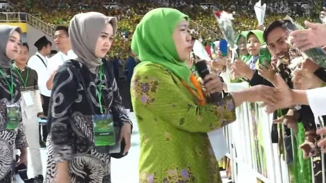 Khofifah terlihat mengenakan seragam gamis batik serta kerudung hijau seperti yang dikenakan jemaah Muslimat NU.