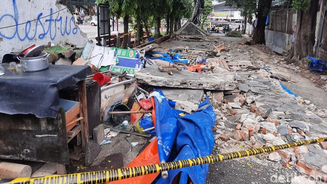 Terpal, botol air mineral, kursi plastik dan meja kayu yang berada di sekitar tembok tampak rusak akibat robohan bangunan itu. Gari polisi sudah membujur di sekitar lokasi.