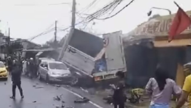 Dalam rekaman yang beredar, terlihat posisi boks daripada truk tersebut nyaris terguling. Muatannya berhamburan.