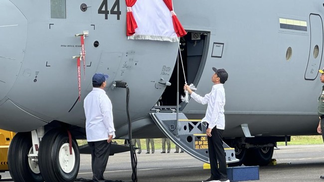 "Tadi kami saksikan dan baru saja dilakukan penyerahan pesawat Super Hercules c-130J ini adalah pesawat angkut yang telah kita pesan beberapa tahun yang lalu dan penting sekali baik untuk perang dan non perang," ujar Jokowi.