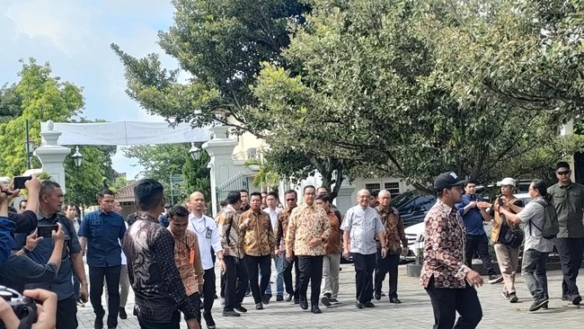 Terlihat Sultan HB X menyambut Anies. Sultan mengenakan batik, kedua tokoh ini pun bersalaman.