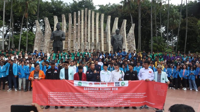 Gabungan Aliansi Badan Eksekutif Mahasiswa (BEM) menggelar deklarasi pemilu damai. Para mahasiswa itu mendukung pemerintahan Joko Widodo (Jokowi) berjalan sesuai dengan amanat konstitusi hingga akhir jabatan.