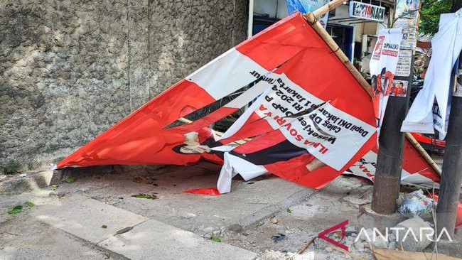 Diketahui, sebuah baliho seorang caleg dari PSI roboh setelah diterpa angin kencang di Cakung, Jakarta Timur. Baliho tersebut kemudian menimpa pengendara motor.
