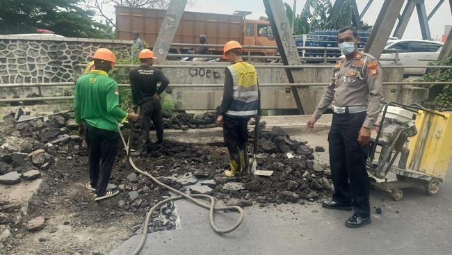 Anggota Polsek Jati Asih melakukan pengawalan selama perbaikan dilakukan. Jembatan tersebut ditutup untuk sementara waktu setelah terjadi amblas.