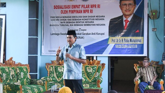 Hal tersebut disampaikan Fadel Muhammad, saat menyampaikan materi Sosialisasi Empat Pilar MPR kerja sama MPR dengan LSM Gerak Gorontalo, di Desa Butungale, Kecamatan Popayato Barat Kabupaten Pohuwato, Provinsi Gorontalo, Kamis (25/1). Acara tersebut dihadiri, tokoh masyarakat, tokoh agama dan masyarakat petani sebagai peserta.