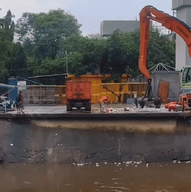 Oknum petugas kebersihan itu terlihat menyapu sendirian. Di sisi kanan dan kiri dari oknum petugas tersebut, ada truk pengangkut sampah dan ekskavator untuk mengambil sampah yang tersangkut di Pintu Air Manggarai.