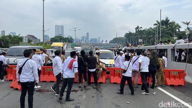 Pantauan detikcom, Rabu (31/1/2024) sekitar pukul 12.00 WIB, massa masuk ke ruas Tol Dalam Kota. Mereka memanjat tembok pembatas jalan tol di sisi Jalan Gatot Subroto.