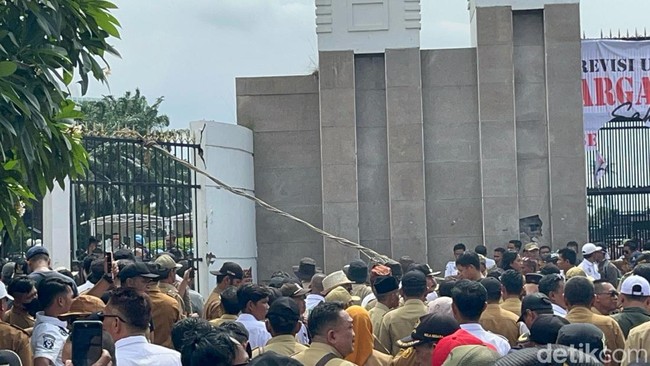 Pantauan detikcom di lokasi, Rabu (31/1/2024) sekitar pukul 14.20 WIB, massa masih mendesak untuk memaksa masuk ke gedung DPR RI.