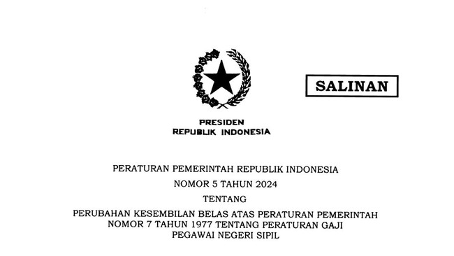 Seperti dilansir situs resmi JDIH Database Peraturan BPK, melalui Peraturan Pemerintah (PP) Nomor 5 Tahun 2024 tentang Perubahan Kesembilan Belas atas Peraturan Pemerintah Nomor 7 Tahun 1977 tentang Peraturan Gaji Pegawai Negeri Sipil.