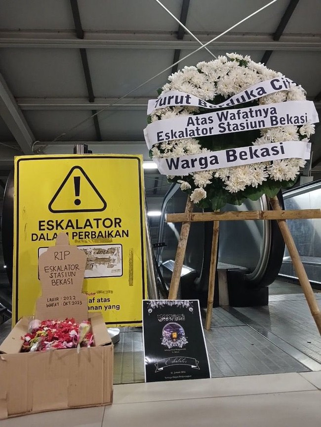 Ada pula miniatur batu nisan bertuliskan, "RIP (Rest In Peace) Eskalator Stasiun Bekasi, lahir 2022, wafat Oktober 2023". Di atasnya, ada taburan bunga tujuh rupa. Di belakangnya, ada keterangan kerusakan eskalator dari pihak stasiun. Keterangan ini sudah terpampang jauh-jauh hari dan tak kunjung dicopot, karena eskalator memang belum diperbaiki.