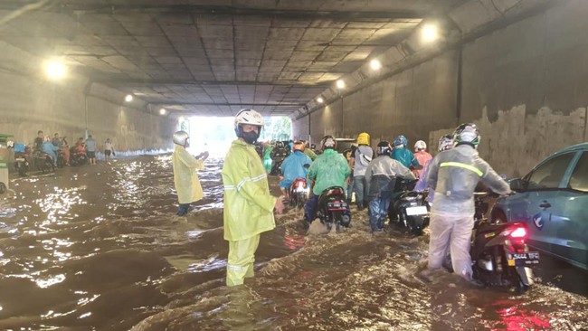 Sementara itu, dilihat dari foto yang diunggah TMC Polda Metro di akun X-nya, sejumlah pengendara menuntun motornya saat melintasi genangan di bawah terowongan Halim tersebut. Sejumlah petugas telah berada di lokasi.