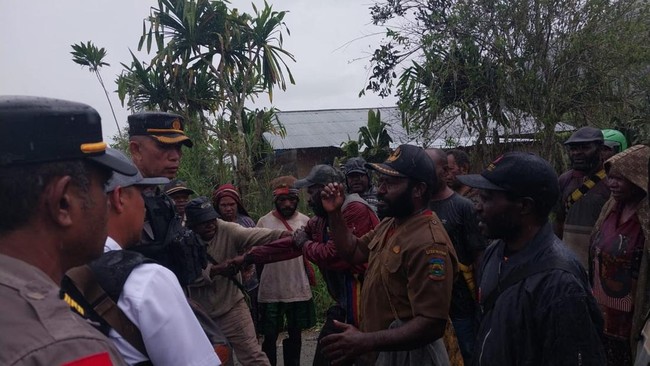 Video viral memperlihatkan sejumlah sejumlah anggota kepolisian diserang oleh warga di kantor Distrik Dogiyai, Papua Tengah. Warga melemparkan batu ke kantor distrik.