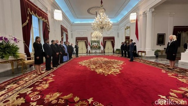 Prosesi penyerahan surat kepercayaan dari para duta besar itu dilakukan di Ruang Kredensial, Istana Merdeka, Jakarta, Kamis (15/2/2024). Hadir dalam acara ini Menlu Retno Marsudi, Seskab Pramono Anung, hingga Kasatpres Heru Budi Hartono.