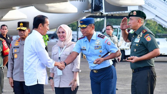 Tampak menyambut kedatangan Jokowi yaitu Pj Gubernur Sulawesi Selatan Bahtiar Baharuddin, Pangdam XIV/Hasanuddin Mayjen Bobby Rinal Makmur, Kapolda Sulawesi Selatan Irjen Andi Rian R Djahadi, Ketua DPRD Provinsi Sulawesi Selatan Andi Ina Kartika Sari, Pangkoopsud II Marsda TNI Budhi Achmadi, Pangdivif 3 Kostrad Mayjen TNI Choirul Anam, Danlanud Hasanuddin Marsma TNI Bonang Bayuaji, Danlantamal VI Makassar Laksamana Pertama TNI Ivan Gatot Pijanto, serta Danrem 141/ Toddopuli Brigjen TNI Sugeng Hartono.