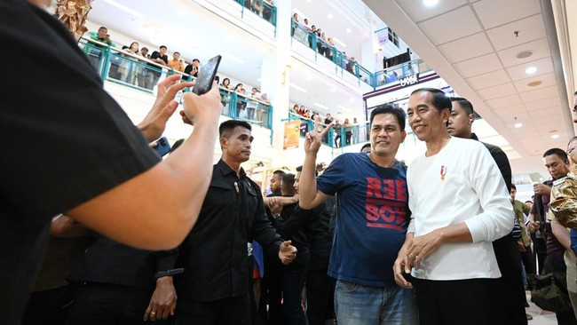 Dilansir Biro Pers, Media, dan Informasi Sekretariat Presiden, Kamis (22/2/2024), Jokowi mengenakan kaus lengan panjang berwarna putih dipadankan dengan celana panjang berwarna hitam. Kedatangan Jokowi membuat suasana mal makin ramai.