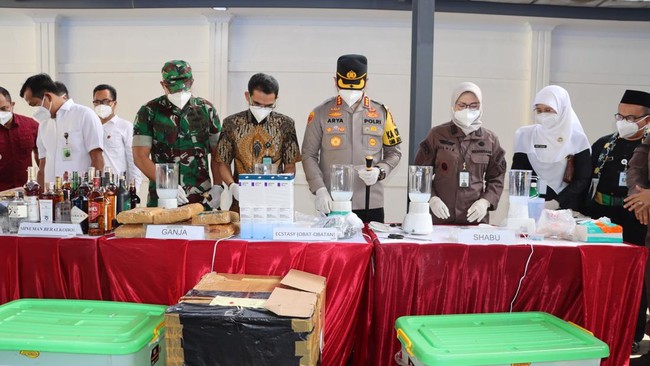 "Untuk barang bukti berupa ganja, pakaian, barang lainnya dan alat hisap sabu (bong) dengan cara dibakar. Senjata tajam dengan cara dipotong, minuman beralkohol dengan cara dilindas dengan alat berat. Sedangkan untuk barang bukti berupa sabu dengan cara dilarutkan dalam air dan cairan kimia," ujarnya.