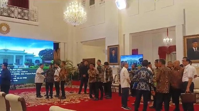 Pantauan detikcom di Istana Negara, Senin (24/2/2024), tampak para menteri saling bertegur sapa sebelum sidang dimulai. AHY dan Menko Polhukam Hadi Tjahjanto sempat menjadi sorotan karena menjadi menteri terbaru yang masuk kabinet.