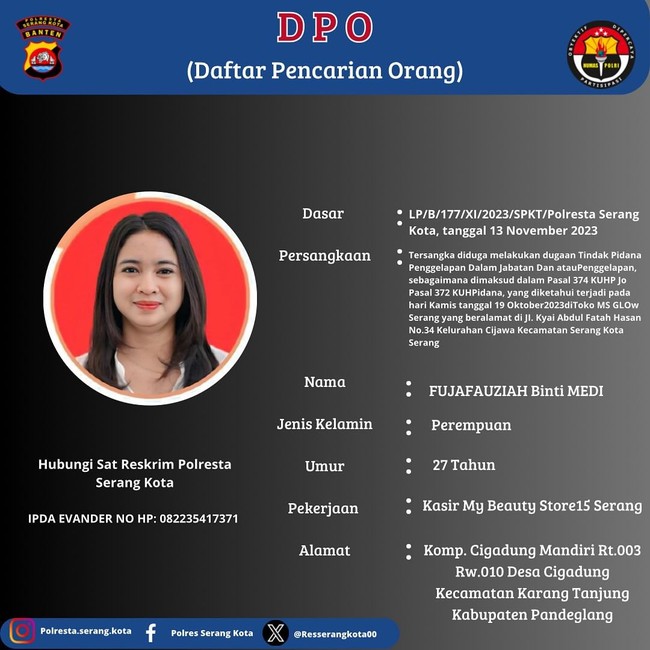 Wanita ini ditetapkan jadi DPO Polresta Serang Kota. Fujafauziah sebelumnya dilaporkan atas dugaan penggelapan sesuai laporan polisi bernomor LP/B/177/XI/2023/SPKT/Polresta Serang Kota, tanggal 13 November 2023.