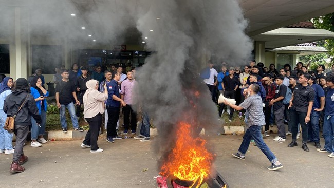 Demo semakin memanas. Massa membakar-bakar ban di depan gedung rektor. Tak cukup sampai di situ, mahasiswa juga turun ke jalan depan kampus Universitas Pancasila. Imbasnya, lalu lintas di Jalan Raya Lenteng Agung, Jakarta Selatan macet.