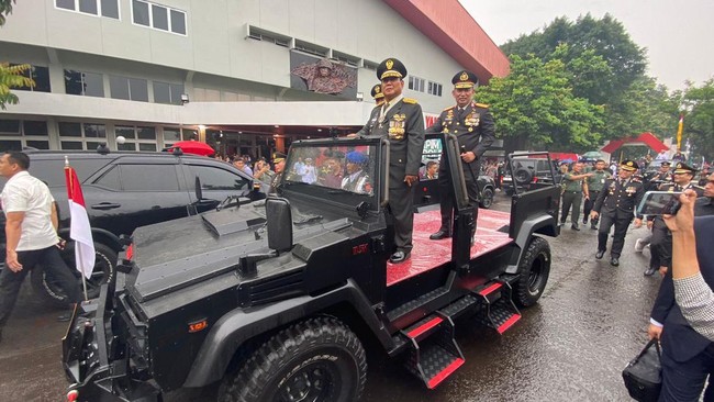 Prabowo bersama Agus Subiyanto dan Listyo Sigit terlihat menaiki kendaraan taktis untuk mengecek Alutsista. Meski rintik hujan, mereka berkeliling mengecek alutsista yang terparkir di halaman GOR Ahmad Yani.